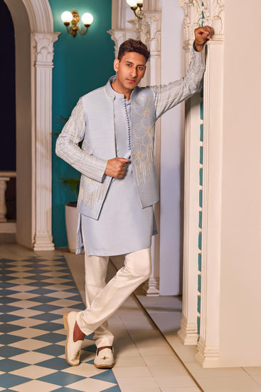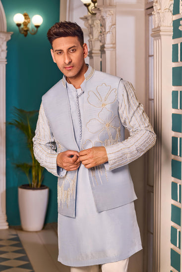 A powder blue bandi kurta set, featuring a matching sleeveless jacket with gold floral embroidery and detailed sleeve accents. It is paired with cotton lycra straight pants; a great pick for festive gatherings or wedding celebrations.