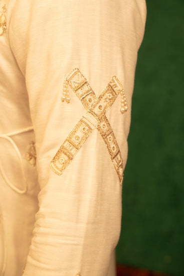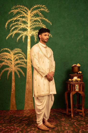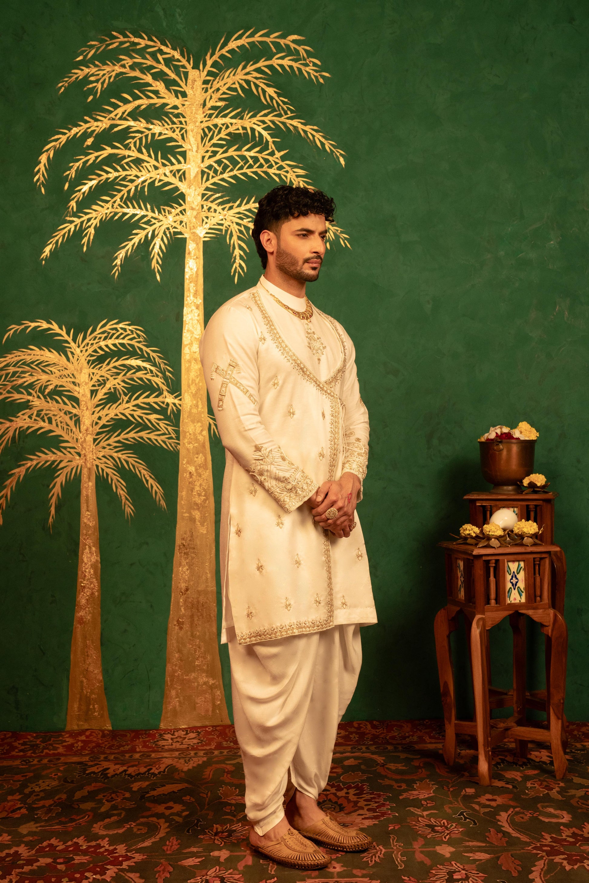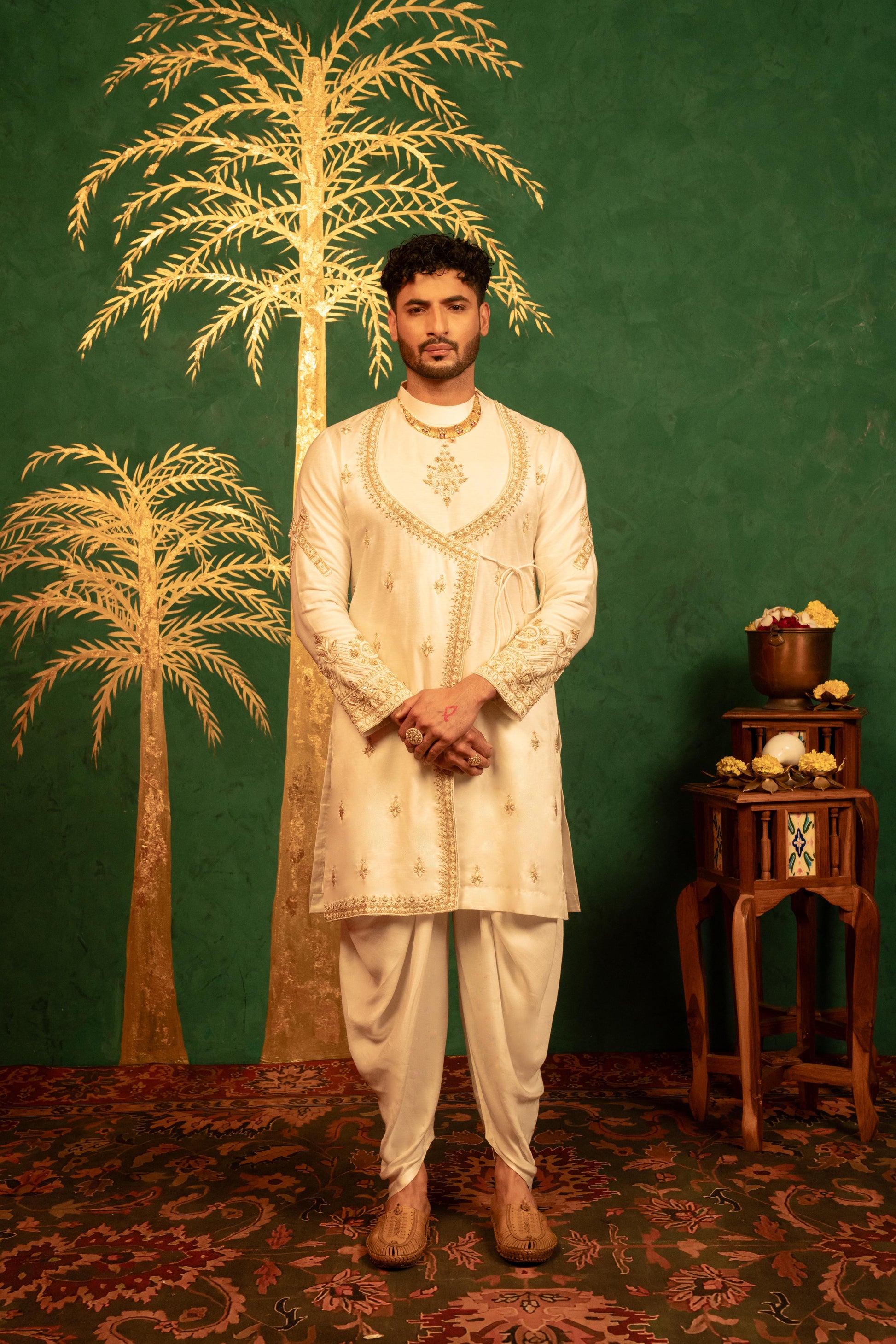 This men’s tussar silk angrakha kurta set features a regal kurta crafted in premium tussar silk, adorned with intricate sadi and zardozi embroidery on the neckline, cuffs, and borders. Paired with a classic draped dhoti, it creates a traditional yet royal silhouette. Ideal for weddings, festive occasions, and grand celebrations.