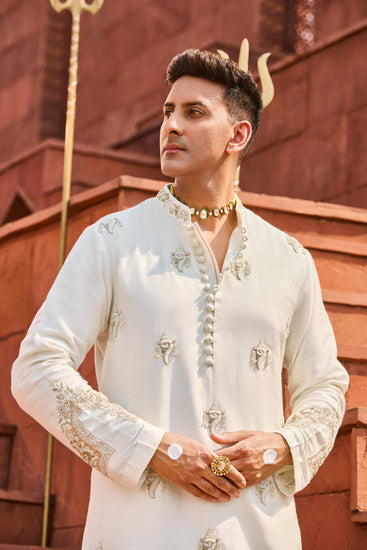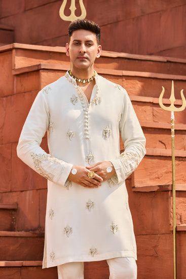 A pearl white tussar kurta set featuring delicate hand-done floral embroidery. It is paired with cotton lycra straight pants, making it an ideal choice for any festive occasions.