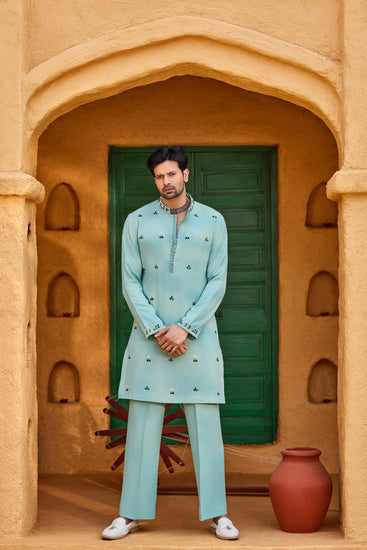 A sea green crepe kurta set with subtle resham thread embroidery, paired with matching crepe pants. Perfect for intimate get-togethers or festive moments.