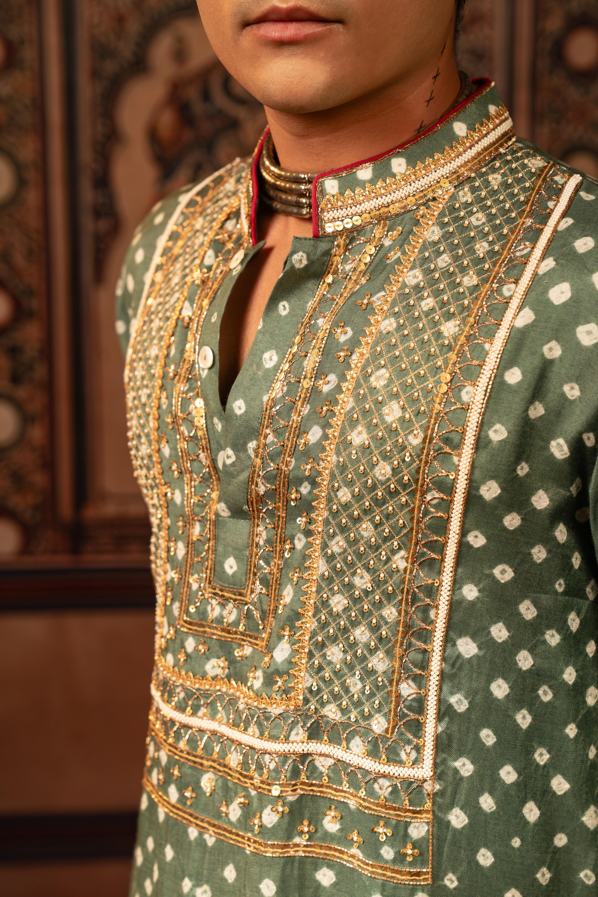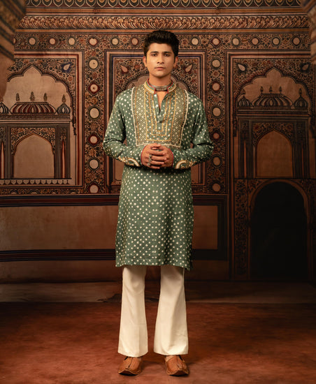 This ensemble showcases a space grey modal satin silk kurta adorned with delicate white bandhani dot patterns. The neckline and sleeve cuffs are enriched with golden zari embroidery and fine threadwork, forming ornate floral and geometric motifs that highlight exquisite craftsmanship. Styled with straight-cut ivory trousers, this look is a graceful choice for Navratri festivities, weddings, and other cultural celebrations.