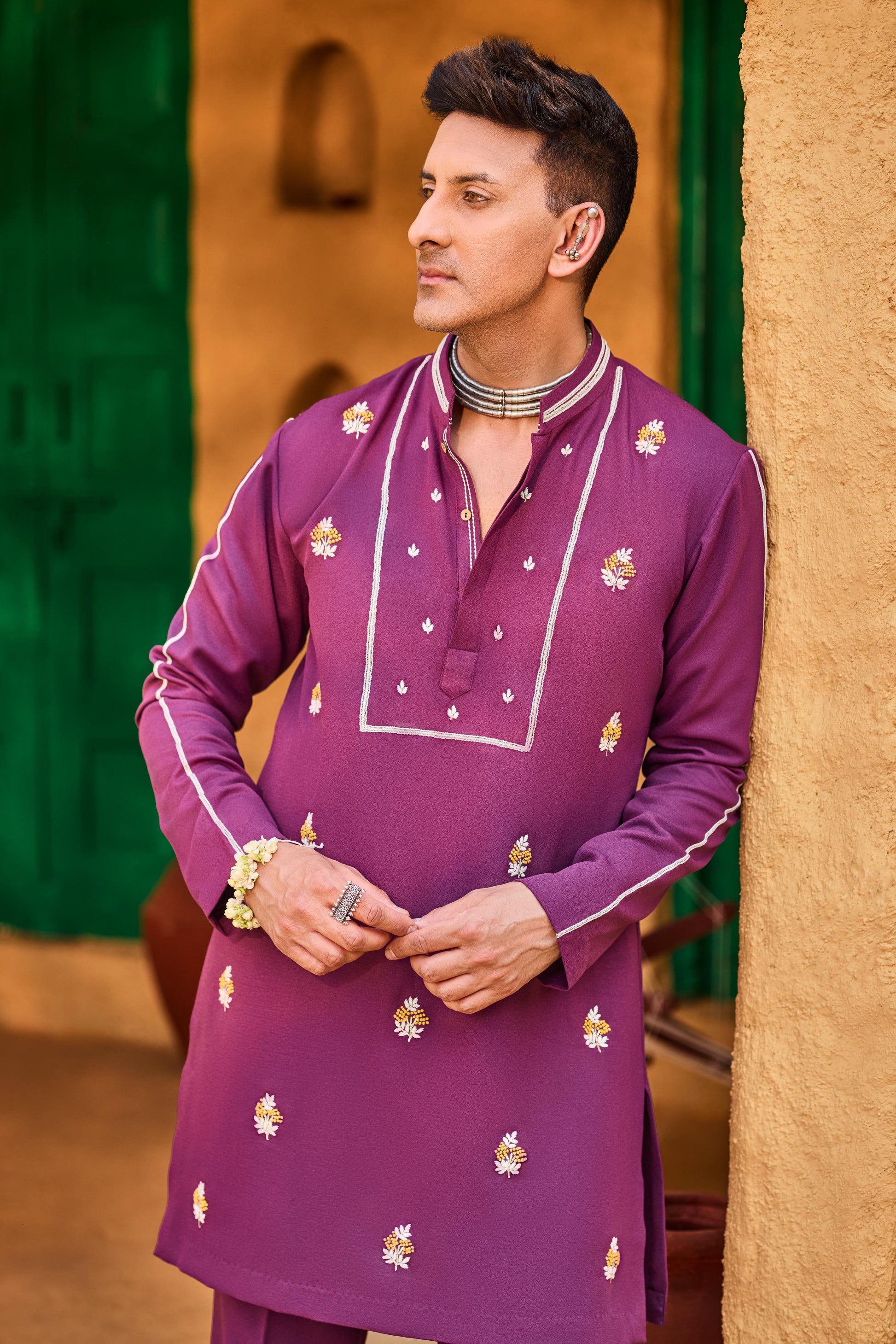A wine crepe kurta set featuring delicate resham and aari floral embroidery, bringing a handcrafted touch to the rich tone. Paired with matching crepe pants, this set is perfect for festive evenings or intimate celebrations.