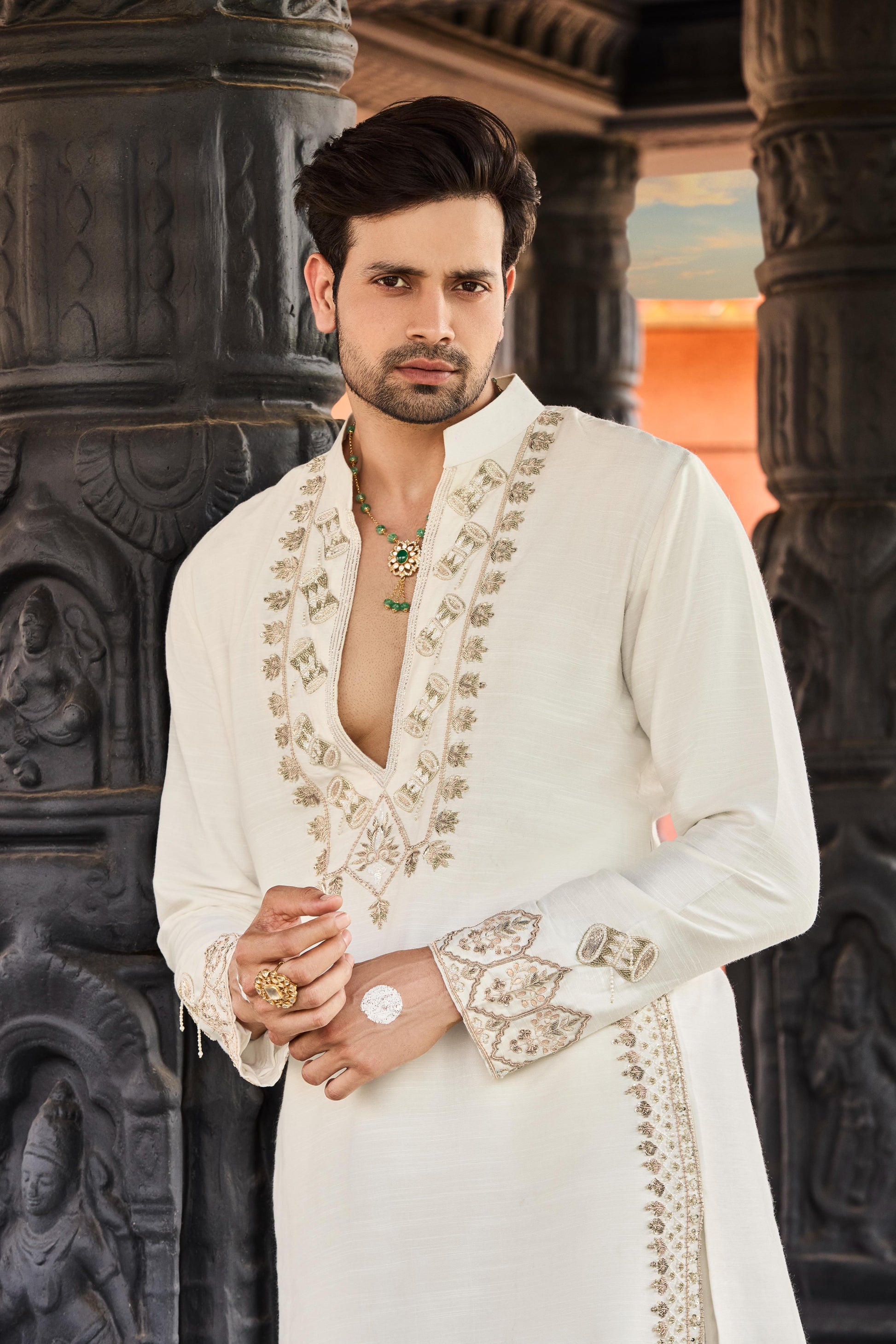 An off-white tussar kurta set detailed with pearl and zardosi embroidery. Paired with classic Aligarhi pants, it's a graceful pick for festive occasions or special celebrations.